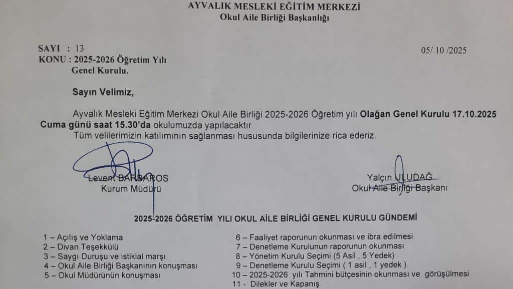 2025-2026 Öğretim Yılı Okul aile Birliği Olağan Genele Kurulu 17.10.2025 Cuma Günü Saat 15.30' da okulumuzda yapılacaktır. Tüm Velilerimiz davetlidir.