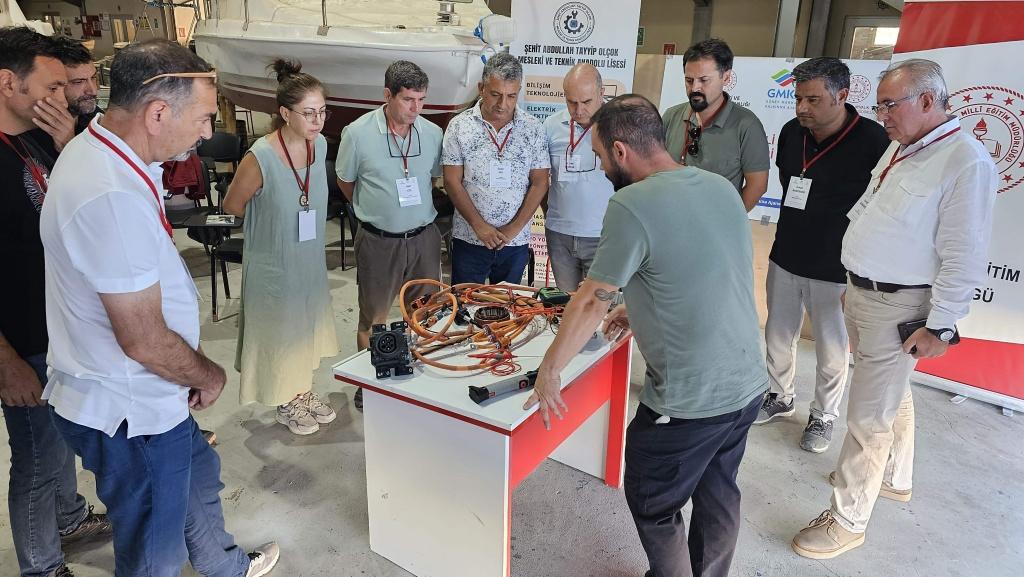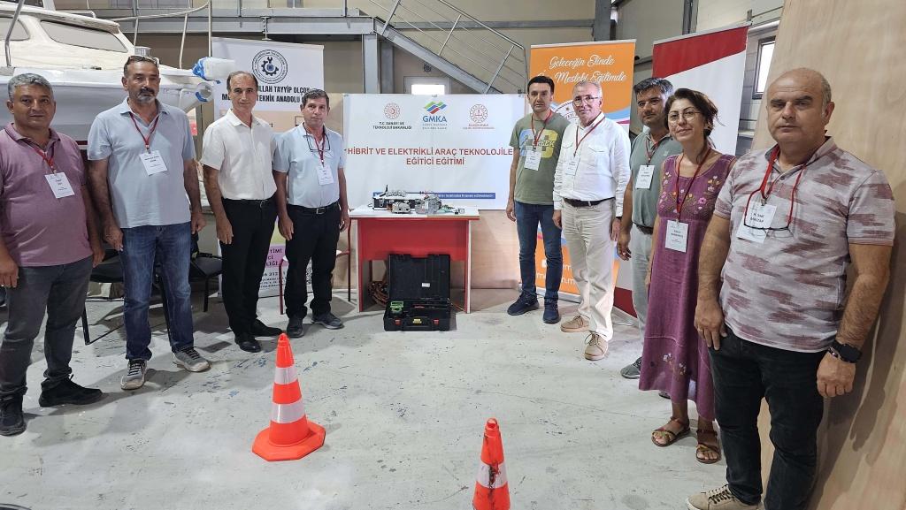 Hibrit ve Elektrikli Araç Teknolojileri Eğitici Eğitimi Projesi" kapsamında Ayvalık'ta görev yapan motorlu araçlar teknolojisi ve elektrik-elektronik teknolojisi öğretmenleri, hibrit ve elektrikli araç teknolojileri alanında teorik ve uygulamalı eğitimlere katıldı. 8 - 10 Eylül 2025 tarihleri arasında Pakmaya Kenan Kaptan Denizcilik Mesleki ve Teknik Anadolu Lisesi atölyelerinde gerçekleştirilen eğitimlerde, toplam 10 öğretmen, 3 gün boyunca 18 saatlik yoğun bir programla hibrit ve elektrikli araç teknolojileri üzerine uygulamalı eğitim aldı.